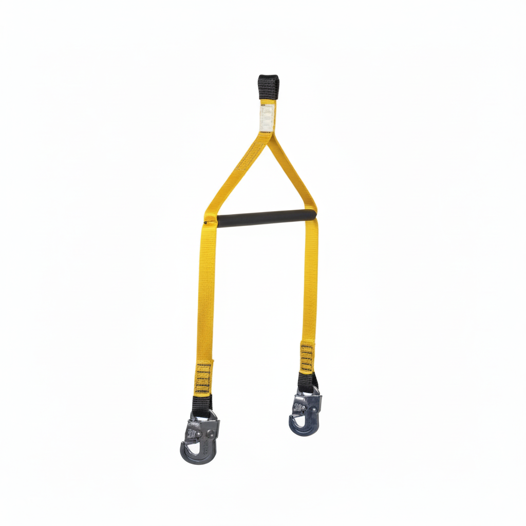 Dispositivo de ancoragem para suspensão por pontos de resgate nos ombros, para uso em cinturões de segurança com este tipo de conexão, confeccionado em cadarço de poliéster, 2 conectores classe “T” com abertura de 17mm em aço.