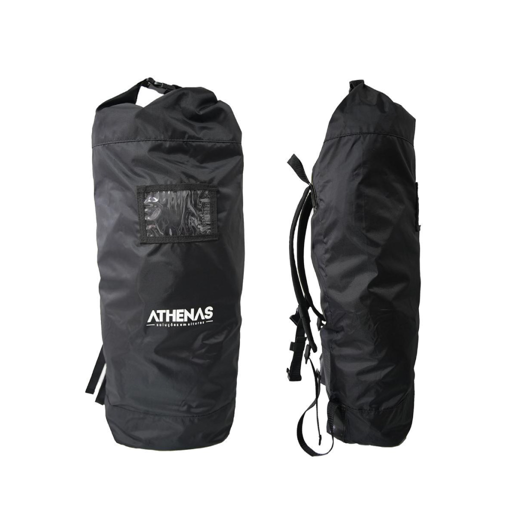 Sacola tipo BAG, Confeccionado com tecido nylon 840 PVC, resistente a água, com as seguintes medidas: 72 cm (A) X 32 cm (L) X 26 cm (P), com capacidade máxima de 50 litros ou 100 metros de corda NR 18, costura reta, fundo com reforço de PVC, fechamento tipo saco estanque com fivelas de nylon, visor de identificação, alça de mão com reforço de EVA e alças com ajustes de altura tipo mochila para uso nas costas.
