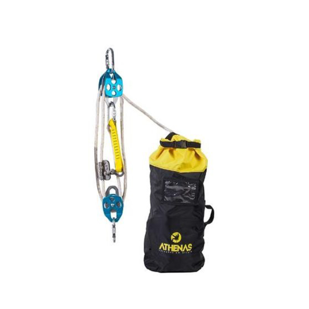 Sistema de polias para redução de carga 4 para 1 com bloqueador mecânico, eficaz para diversos tipos de trabalhos em resgate e espaço confinado, próprio para uso no Tripé AT 9003 ou similar, extremidade das cordas fechadas por sistema de costura suportando até 22 kN, com proteção termo retrátil, que facilita o uso e substitui o nó de segurança, minimizando erros em nós e perda de resistência do sistema em decorrência de nós errados.