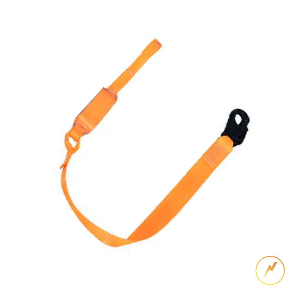 Talabarte de Segurança modelo “I” confeccionado em fita retardante à chamas 45mm, com absorvedor de energia, um conector DIELÉTRICO classe “A” com abertura de 55mm, com dupla trava de segurança, alça em poliéster retardante a chamas na outra extremidade para laçar no ponto de conexão do cinto paraquedista.