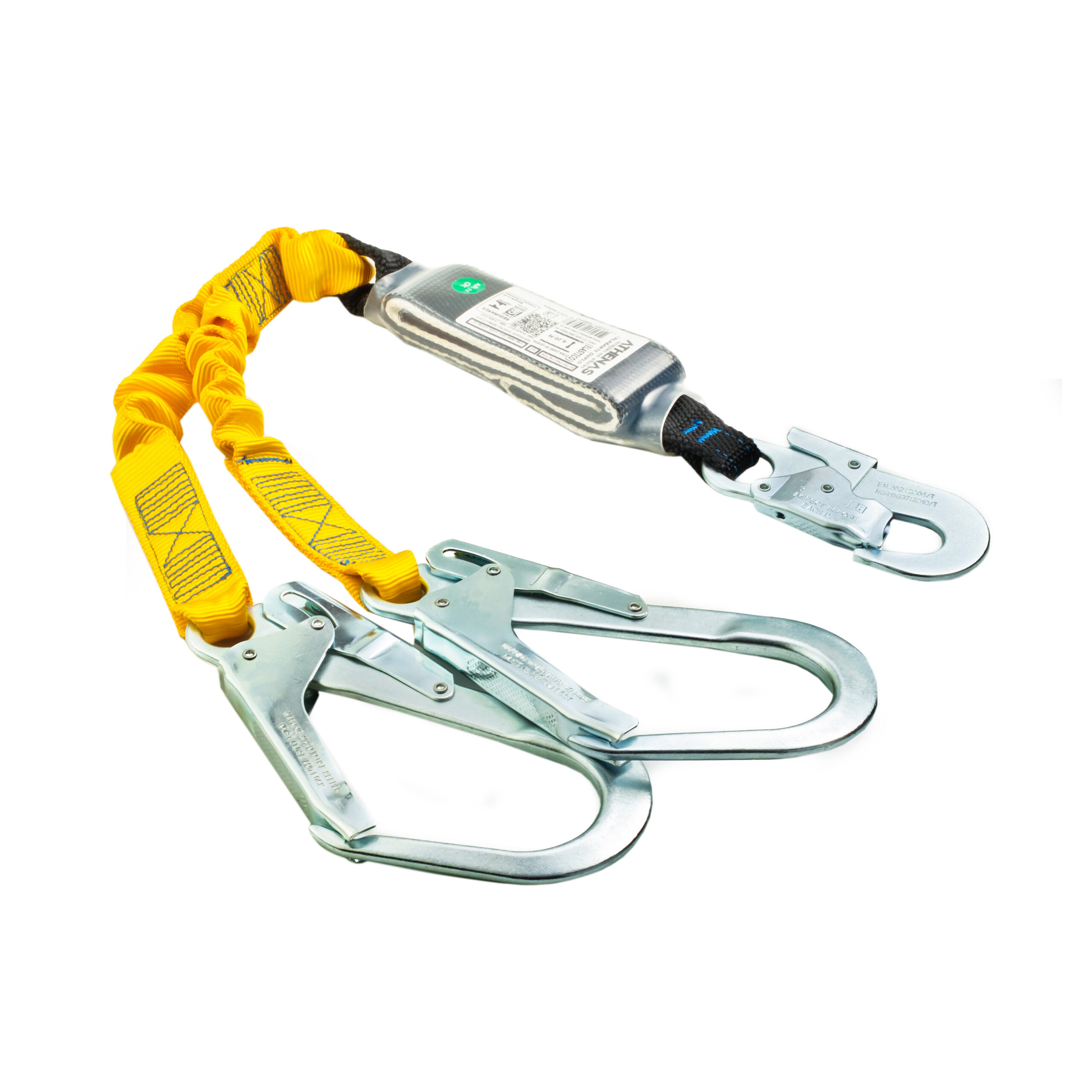 Talabarte de Segurança duplo modelo “Y” confeccionado elástico tubular em poliéster de alta tenacidade de 30mm de largura, dois conectores classe “A” em aço com abertura de 55 mm, um conector classe “T” em aço, com abertura de 17 mm ambos conectores com dupla trava de segurança e absorvedor de energia integrado, com laudo para usuários até 140 Kg. (vide uso correto no manual de instruções)